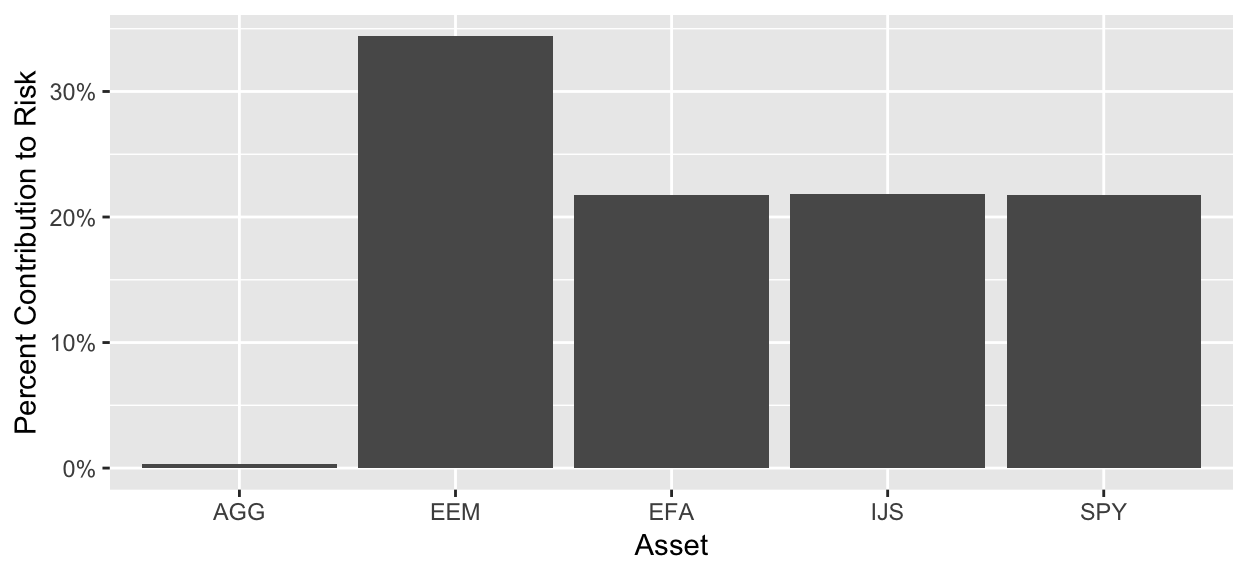 While we have the tibbles in front of us, notice that EEM has a 25% weight but contributes 34% to the volatility. That’s not necessarily a bad thing, but we should be aware of it.